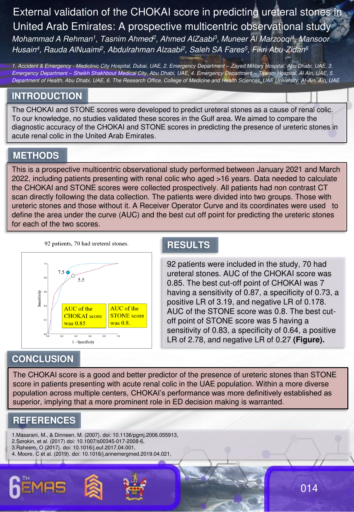 014. EXTERNAL VALIDATION OF THE CHOKAI SCORE IN PREDICTING URETERAL STONES IN UNITED ARAB EMIRATES: A PROSPECTIVE MULTICENTRIC OBSERVATIONAL STUDY